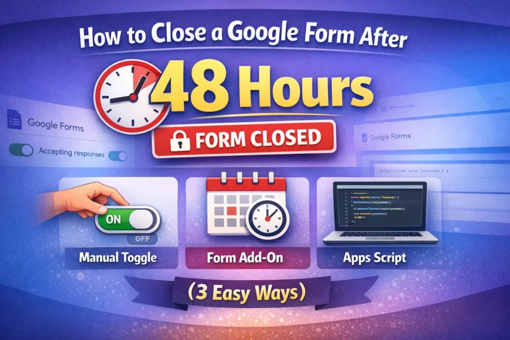 How to Close a Google Form After 48 Hours (3 Easy Ways) How to Close a Google Form After 48 Hours (3 Easy Ways) Last updated: December 18, 2025 • UVs Blog Sometimes you need a Google Form to accept responses only for a short window—like 48 hours—then stop. This guide shows three practical ways […]